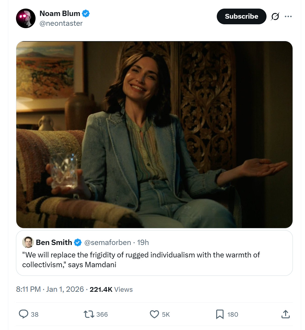 To me, the current real-world ideology that most closely parallels that of The Hive Mind in Pluribus is Islamism. “Islam”’s literal meaning is “submission”. Even if any of the show’s creators had the spread of political Islam in mind when they wrote about The Hive, I doubt this is something that they would even discuss in the writers’ room; it’s certainly something they would never admit in public. But I don’t think it’s an accident—conscious or otherwise—that the one member of The Immune who is hinted to be an active collaborator with The Pod People hails from an Islamic country and responds to The Joining by taking up a literal harem of women.